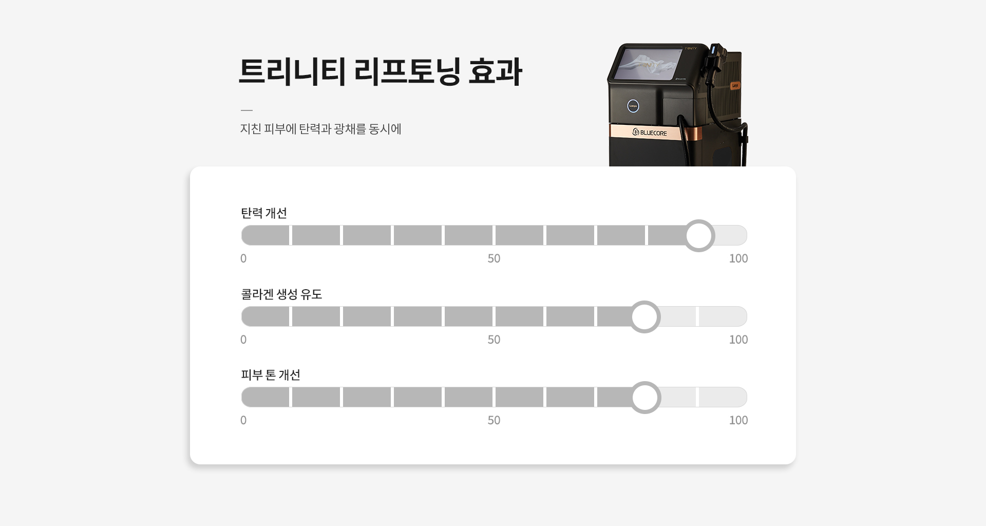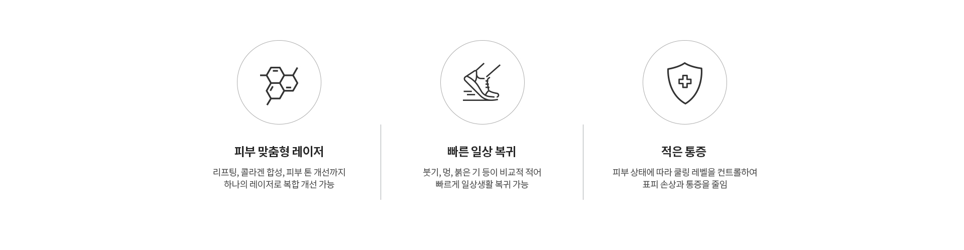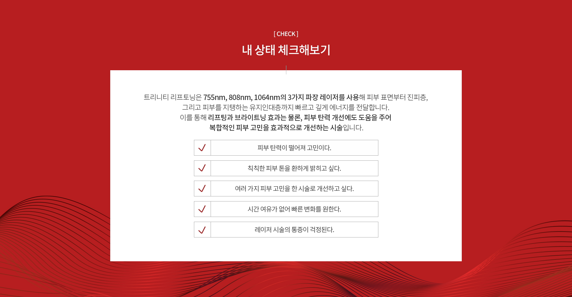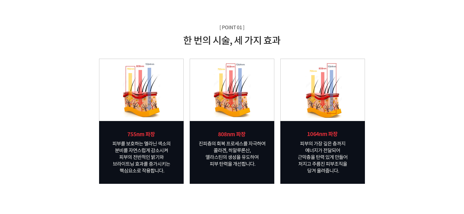 755nm, 808nm, 1064nm 3가지 파장의 레이저가 동시에 조사되어 유지인대 구간을 강화시켜 윤곽라인을 매끄럽게 정리하고 리프팅 효과와 함께 피부 톤을 개선합니다.