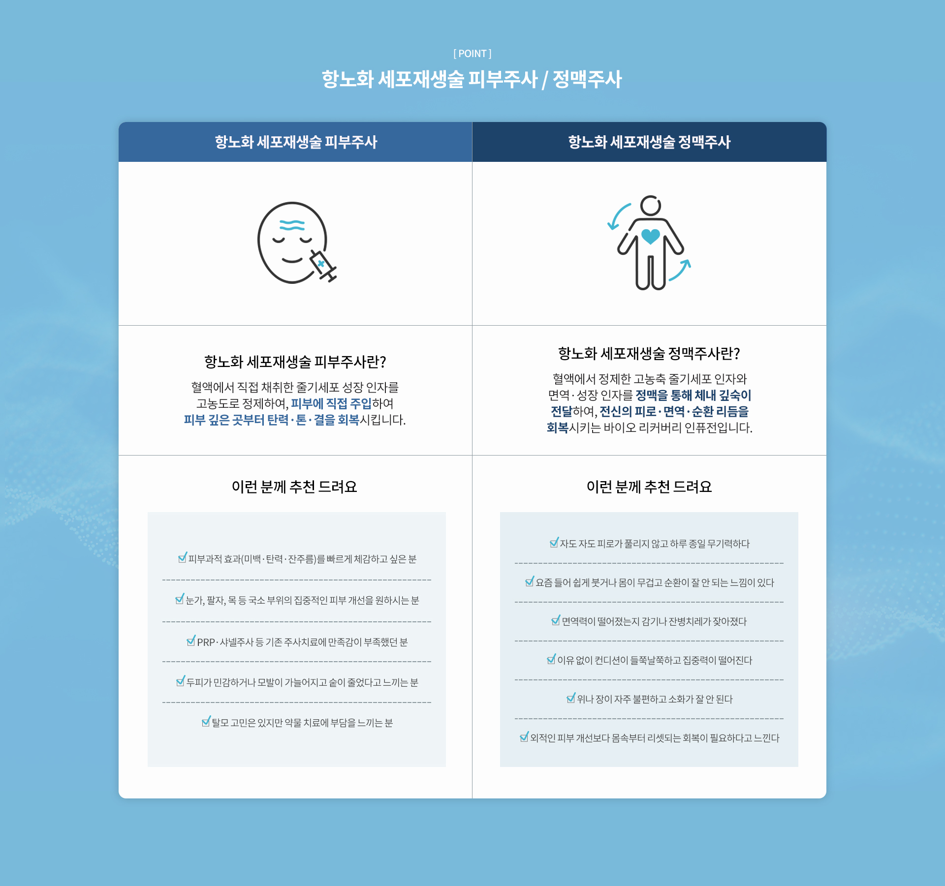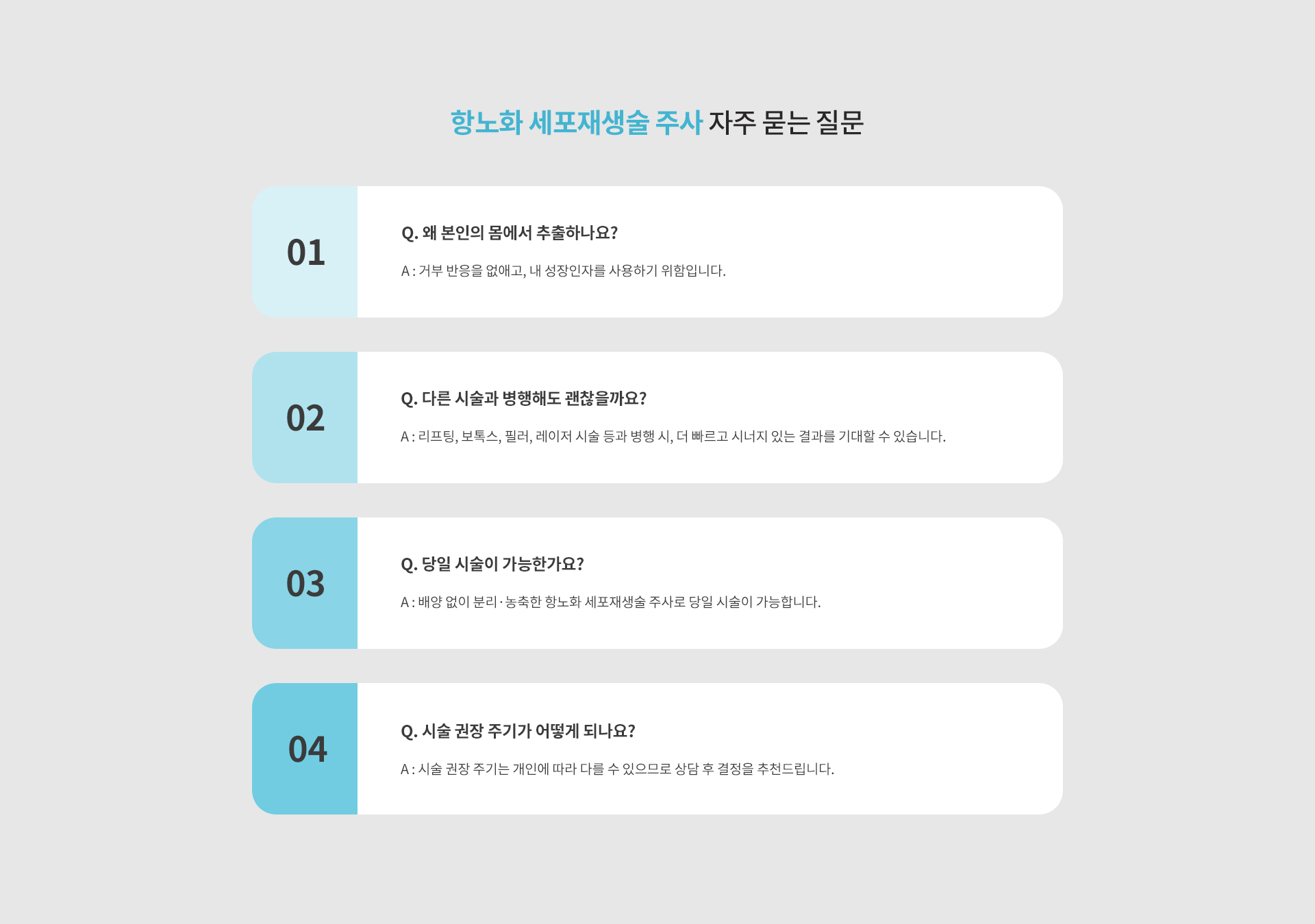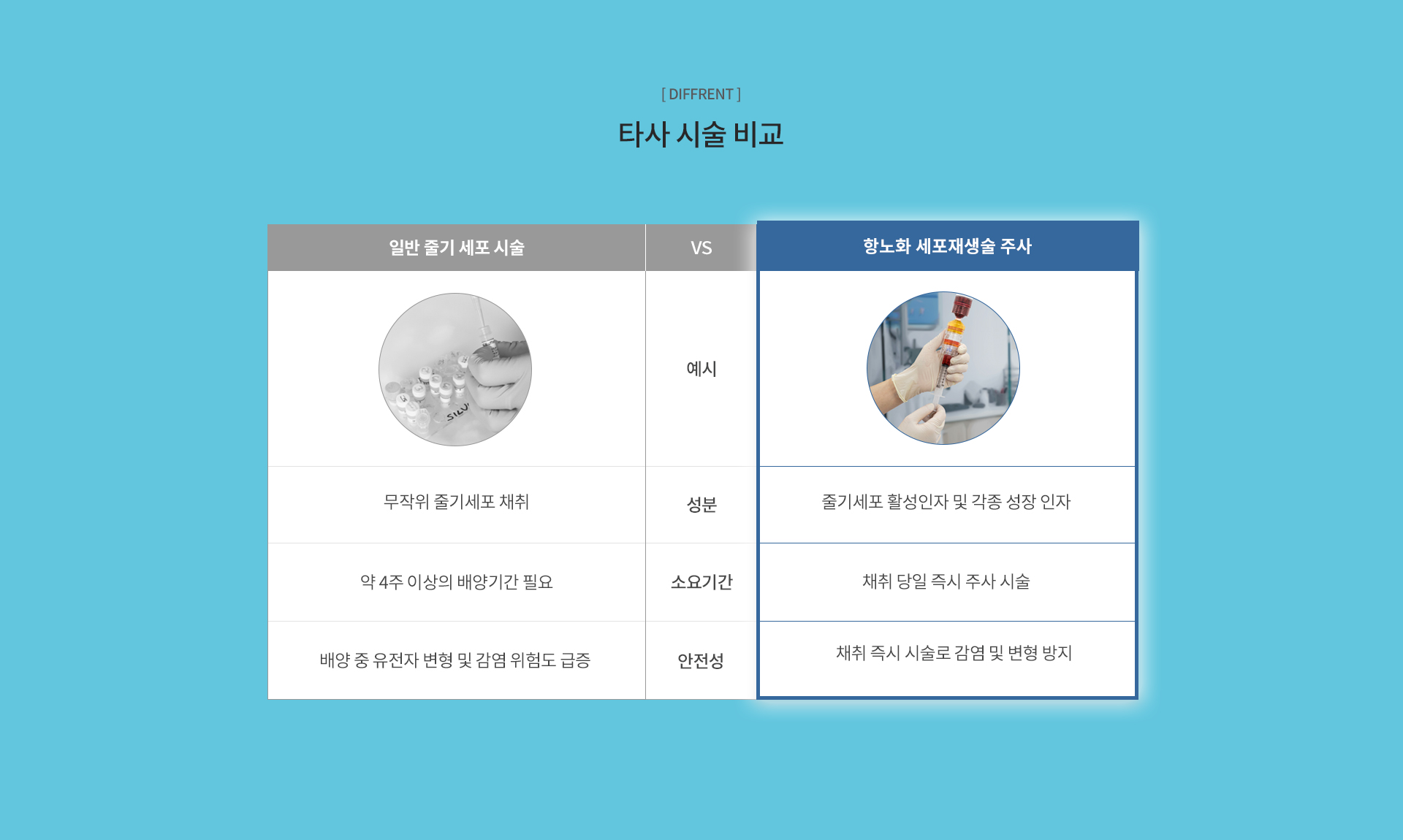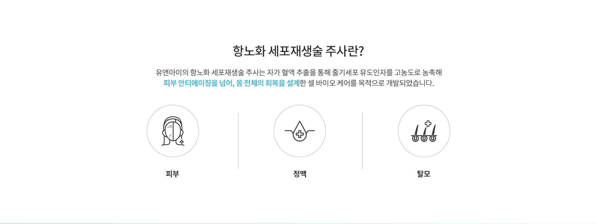 항노화 세포재생술은 줄기세포 유도인자를 고농도로 농축하여 피부 재생과 회복을 촉진시켜줍니다.
